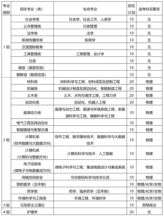 注:公共管理类、法学类、计算机类(计算机与智能方向)、网络空间安全、环境科学与工程类专业位于青岛校区;根据生源情况,各专业招生计划可适当调整;考生只能报考其中一个组别的专业,最多可报6个专业志愿,并可选择是否服从专业调剂;考生选考科目应符合所报专业(类)的选考科目要求,否则该专业志愿无效,“物理/化学/生物”表示三门任选一门即可;综合评价招生各专业学费标准按照山东省物价管理部门要求执行。